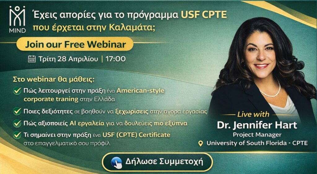 Δήλωσε συμμετοχή στο Webinar USF CPTE Τρίτη 28 Απριλίου | 17:00Έχεις απορίες για το πρόγραμμα USF CPTE που θα υλοποιηθεί στην Καλαμάτα; Δήλωσε συμμετοχή στο δωρεάν webinar και μάθε από την ίδια την Dr. Jennifer Hart (University of South Florida): Πώς λειτουργεί ένα American-style corporate training Ποιες δεξιότητες ζητά σήμερα η αγορά Πώς αξιοποιείς ΑΙ εργαλεία Γιατί το USF CPTE Certificate ενισχύει το βιογραφικό σου Τρίτη 28 Απριλίου | 17:00 OnlineΔήλωσε συμμετοχή δωρεάν! Δήλωση Συμμετοχής Ποιο είναι το βασικό σου ενδιαφέρον για το πρόγραμμα; Να αναβαθμίσω τις επαγγελματικές μου δεξιότητεςΝα ενισχύσω το βιογραφικό μου με ένα διεθνές certificateΝα μάθω πώς χρησιμοποιούνται AI εργαλεία στην πράξηΑπλά θέλω να μάθω περισσότερες πληροφορίες Πόσο πιθανό είναι να συμμετάσχεις στο πρόγραμμα; Πολύ πιθανό – με ενδιαφέρει άμεσαΕνδιαφέρομαι και θέλω περισσότερες πληροφορίεςΠαρακολουθώ απλά ενημερωτικά το webinar Στοιχεία επικοινωνίας Θα επικοινωνήσουμε σύντομα μαζί σου για να σου δώσουμε περισσότερες πληροφορίες. Ονοματεπώνυμο* Email* Αριθμός τηλεφώνου* Η MIND - Mediterranean Inspiration & Development ίσως θελήσει να επικοινωνήσει μαζί σας. Συμφωνώ να χρησιμοποιηθούν τα στοιχεία μου για επικοινωνία σχετικά με το webinar και το πρόγραμμα USF CPTE.